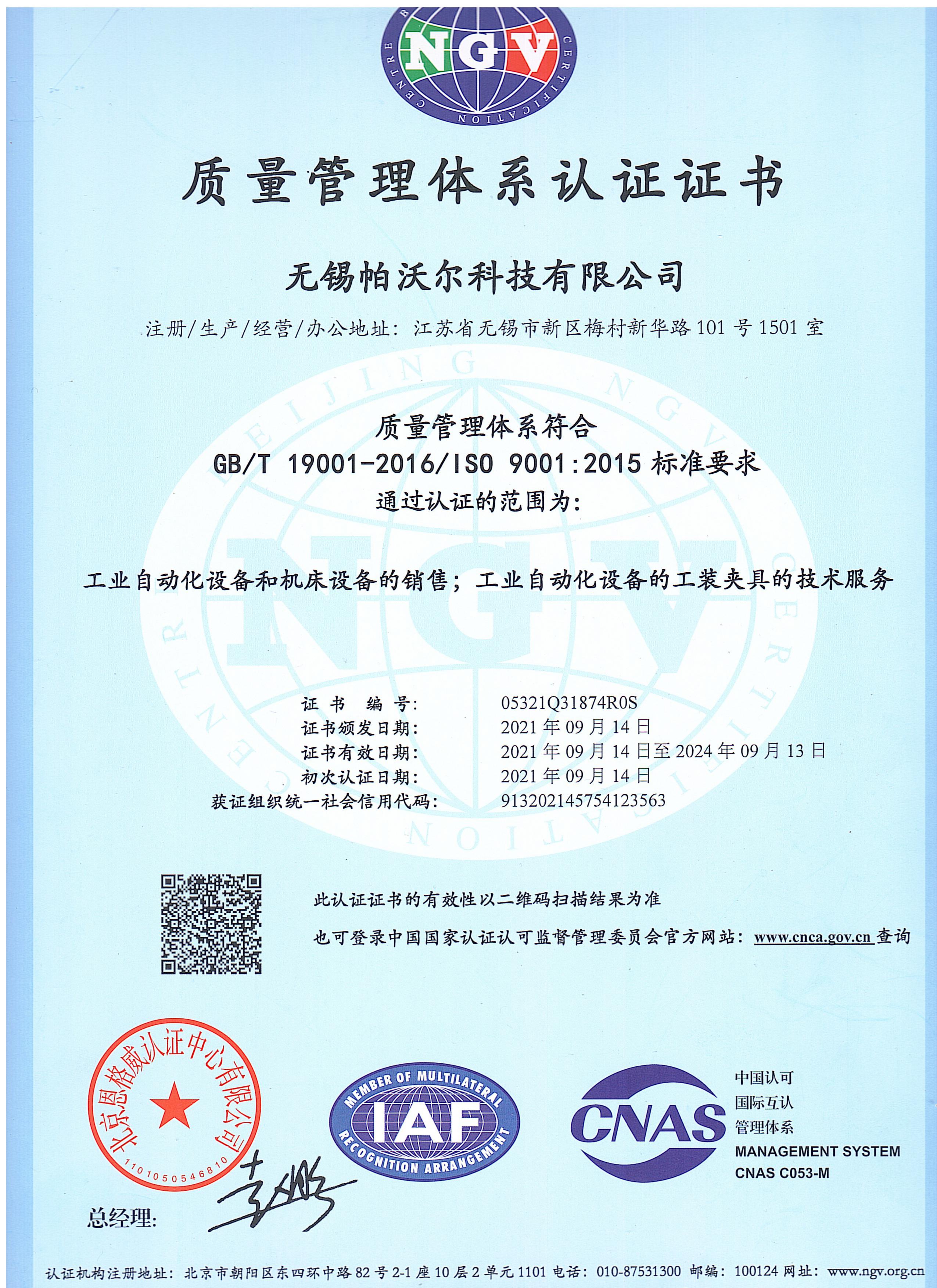 质量管理体系认证证书