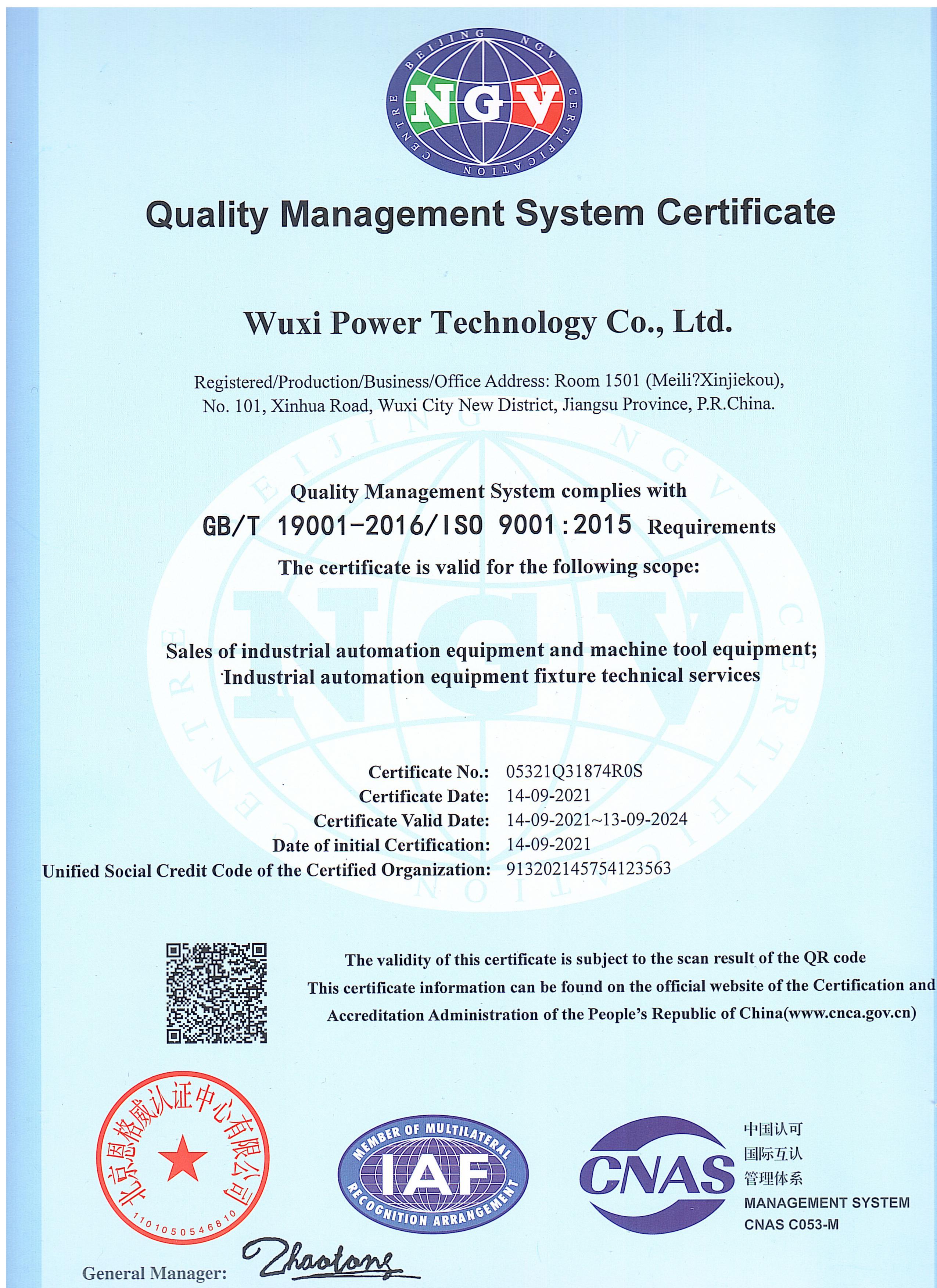 质量管理体系认证证书英文版